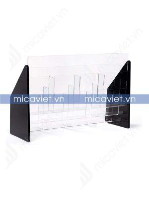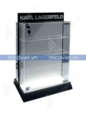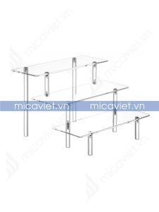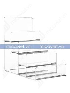 Kệ trưng bày mica là sản phẩm gia công mica không thể thiếu trong các cửa hàng thời trang, mỹ phẩm, điện tử và các lĩnh vực khác. Nhờ vào độ trong suốt và khả năng chịu lực tốt, kệ mica là lựa chọn hàng đầu của nhiều cơ sở kinh doanh. Các kệ trưng bày mica có thể được gia công theo nhiều kích thước, hình dạng khác nhau theo yêu cầu khách hàng.